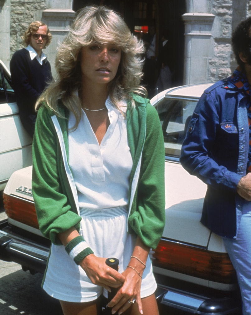 1976年5月,女演员法拉·福西特在花花公子豪宅外手持网球拍摆姿势拍照,叠戴了两条天然钻石手链