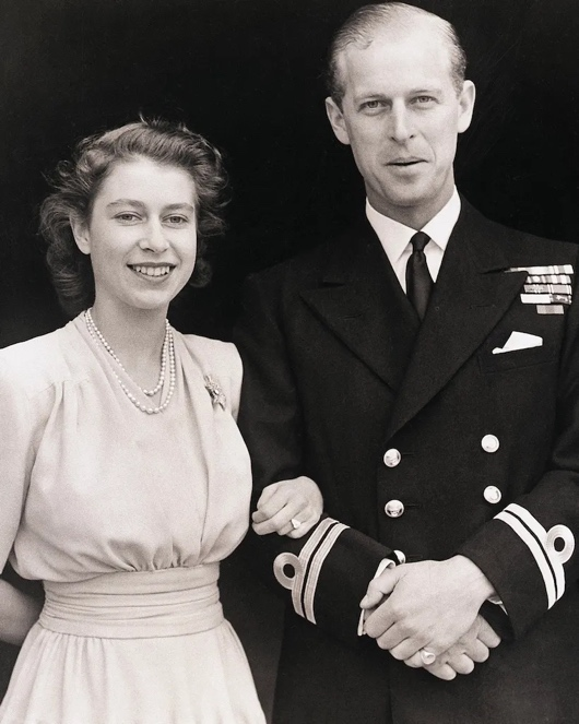 (左)摄于1947年7月,伊丽莎白公主和爱丁堡公爵菲利普亲王在白金汉宫宣布订婚后不久