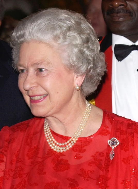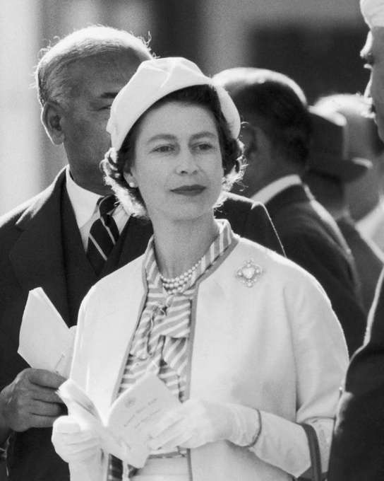 (右)英国女王伊丽莎白二世出席了在牙买加总督府举行的招待会,她佩戴了库里南六号和八号钻石胸针