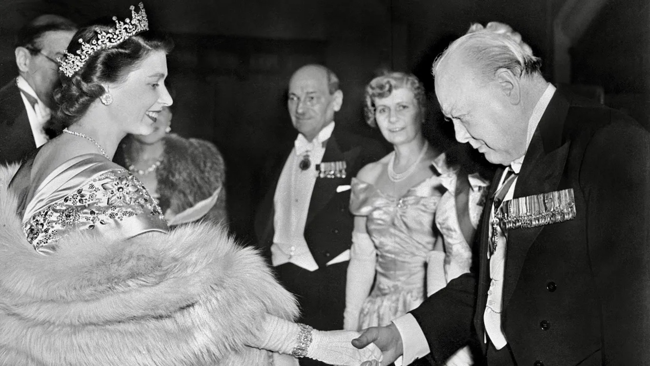 1950年3月23日,英国伊丽莎白公主佩戴爱丁堡结婚手镯在伦敦市政厅举行的招待会上迎接温斯顿·丘吉尔