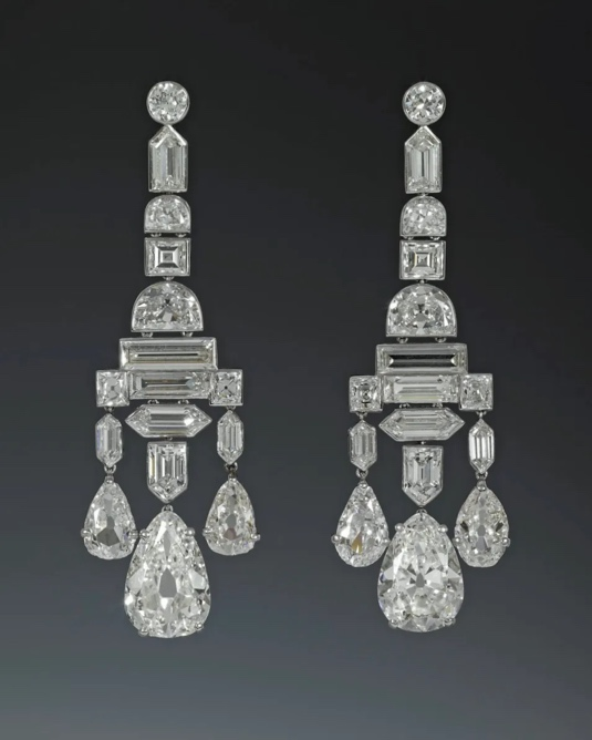 格雷维尔吊灯耳环融合了多种不同的钻石切割工艺,这要归功于20世纪初技艺精湛的工匠们。格雷维尔女士于1918年12月委托卡地亚制作了第一副耳环。在 《女王的钻石》一书中,作者休·罗伯茨爵士将这对耳环描述为“花式切割明亮式水滴耳环”。耳环由明亮式切割、半月形切割、长方形切割、梯形切割、棒状切割、 祖母绿形切割和梨形切割的钻石水滴组成,并以铂金镶嵌。