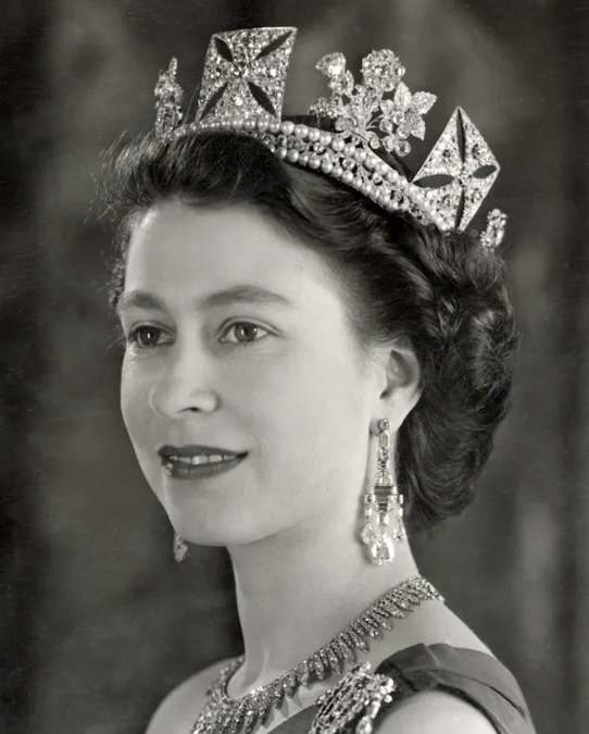 (右)1953年4月,伊丽莎白二世女王在白金汉宫的绿色会客厅佩戴了格雷维尔吊灯耳环