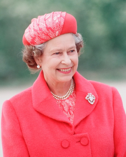 2011年4月29日,伊丽莎白二世女王在威廉王子和凯特王妃的皇家婚礼上佩戴了情人结胸针