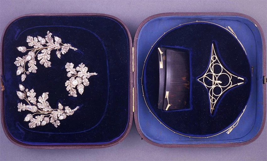到了维多利亚女王统治时期 (1837-1901),英国是历史上最强盛的时候,经济和文化充分发展,这一时期的首饰大多造型奢华,大量采用天然钻石镶嵌。受到新古典主义的影响,珠宝设计中也广泛运用了植物与花卉的题材,与这一时期流行的可拆卸珠宝工艺相结合,诞生了大量植物枝叶状饰品——以写实手法表现花卉或枝叶,可以单独作为胸针或发饰,也可以组合成为大件珠宝,如头冠。