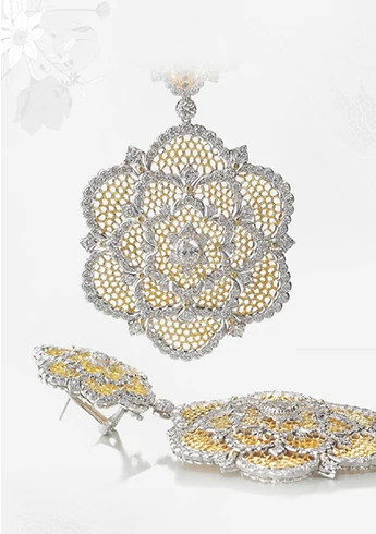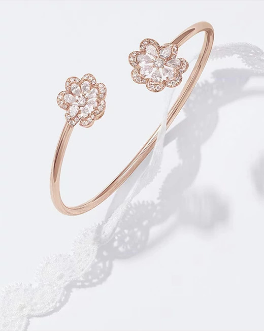 Chopard萧邦Precious Lace系列珠宝在设计细节上巧妙呈现出精美复古蕾丝的繁复花纹、涡卷纹饰、波纹和扇形花边,以镂空镶嵌的天然钻石,勾勒出华丽轻盈的蕾丝图案,细节精致优雅。