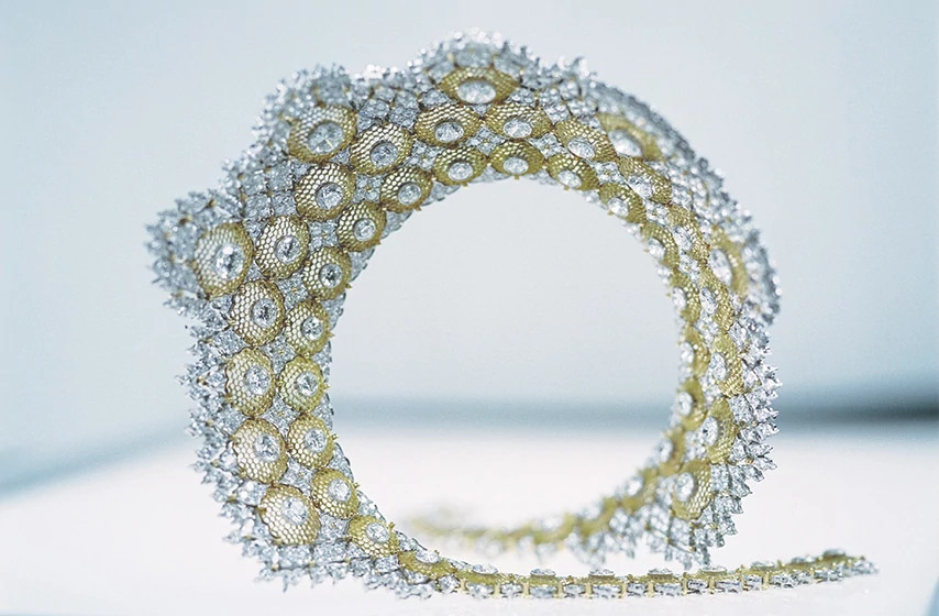 珠宝设计师也深受启发,将高级定制服装应用于珠宝作品的设计中,从经久不衰的款式,到千变万化的面料,再到百般雕琢的细节,设计师们以天马行空的创造力,让高级定制服装所蕴含的迷人魅力幻化为天然钻石、珠宝与贵金属的华美协奏曲。